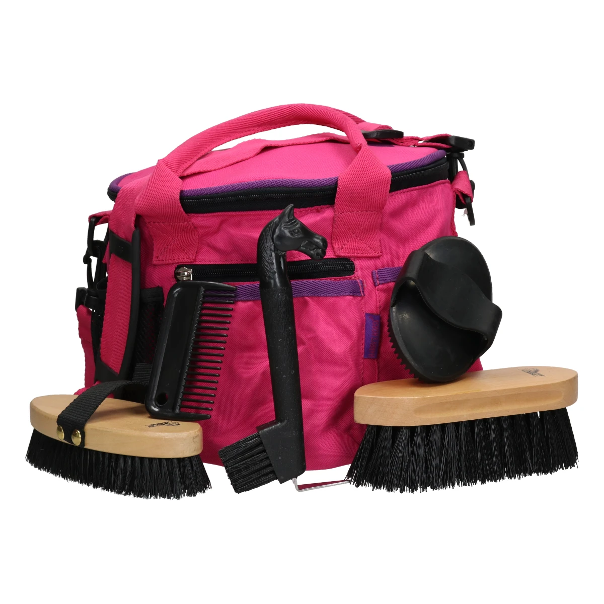 - wordt geleverd inclusief borstelset; rubberen rosborstel, glansborstel, harde borstel, manenkam en hoevenkrabber