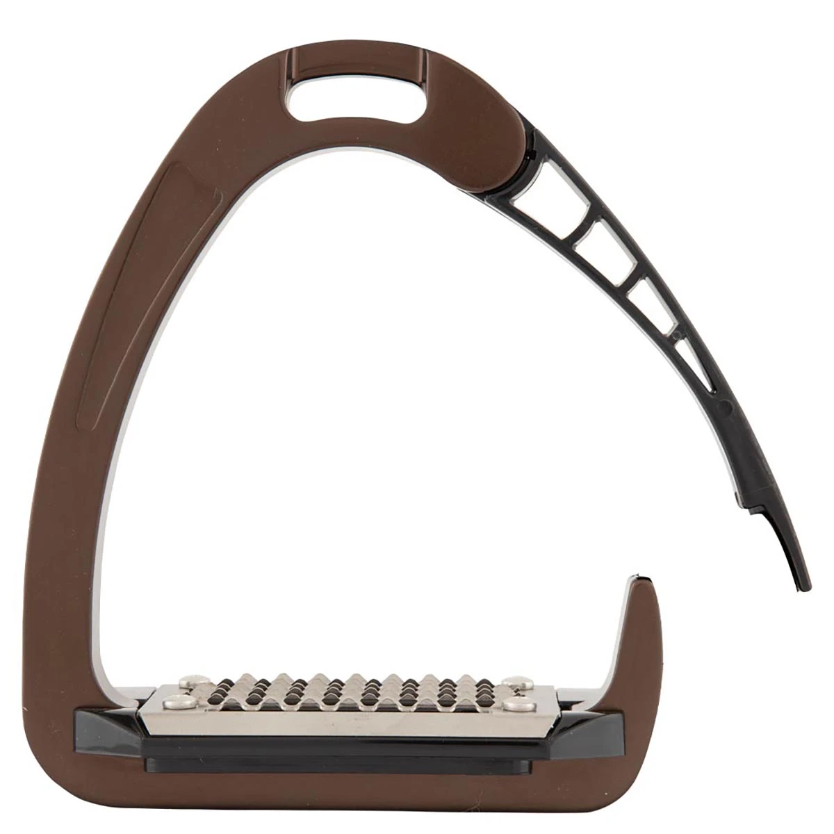 - het gewicht van de ruiter zorgt ervoor dat de beugel opent bij een val, zo blijft de voet niet in de beugel hangen